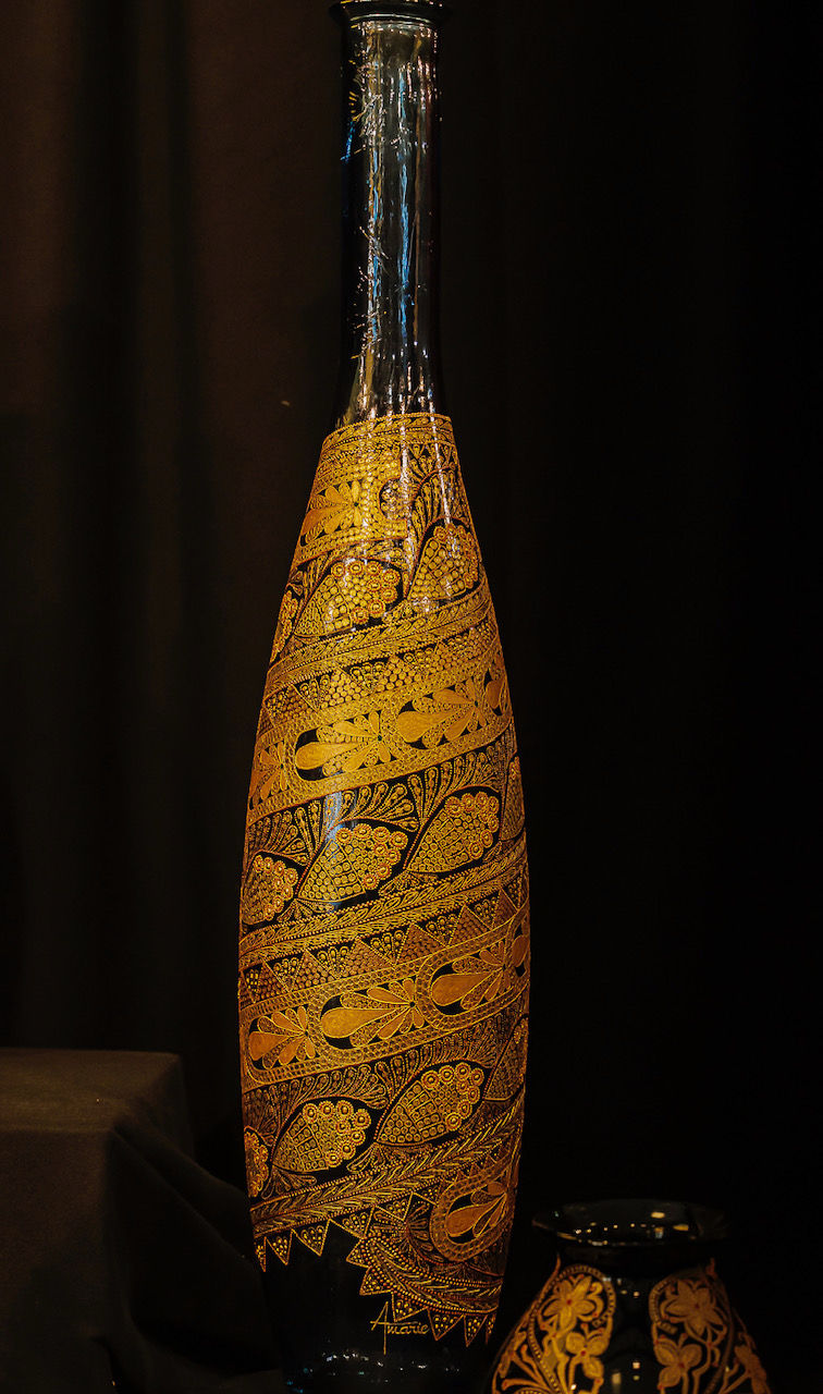Réalisation sur un vase en verre recyclé doré mat, d’une hauteur de 40 cm.